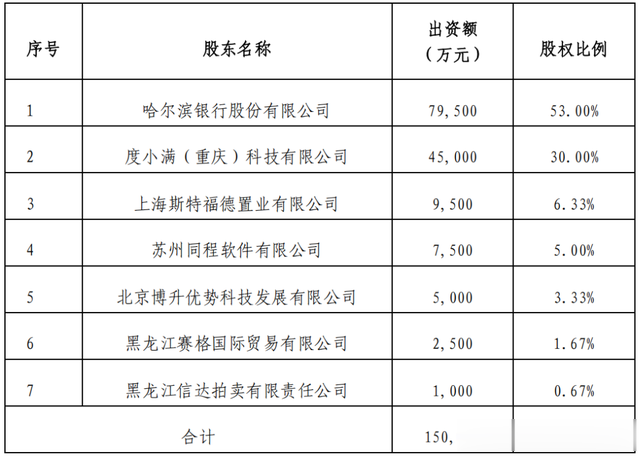 哈银消费金融成立于2017年1月,注册资本15亿元,是全国第19家开业的持牌消金公司。年报披露,报告期末,公司共有7名股东,分别为哈尔滨银行股份有限公司持股53%、度小满(重庆)科技有限公司持股30%、上海斯特福德置业有限公司持股6.33%、苏州同程软件有限公司持股5%、北京博升优势科技发展有限公司持股3.33%、黑龙江赛格国际贸易有限公司持股1.67%和黑龙江信达拍卖有限责任公司持股0.67%。